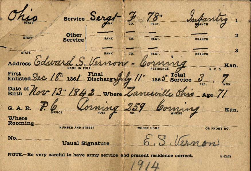 on photo to see card he filled out in 1914, probably at a GAR Reunion.